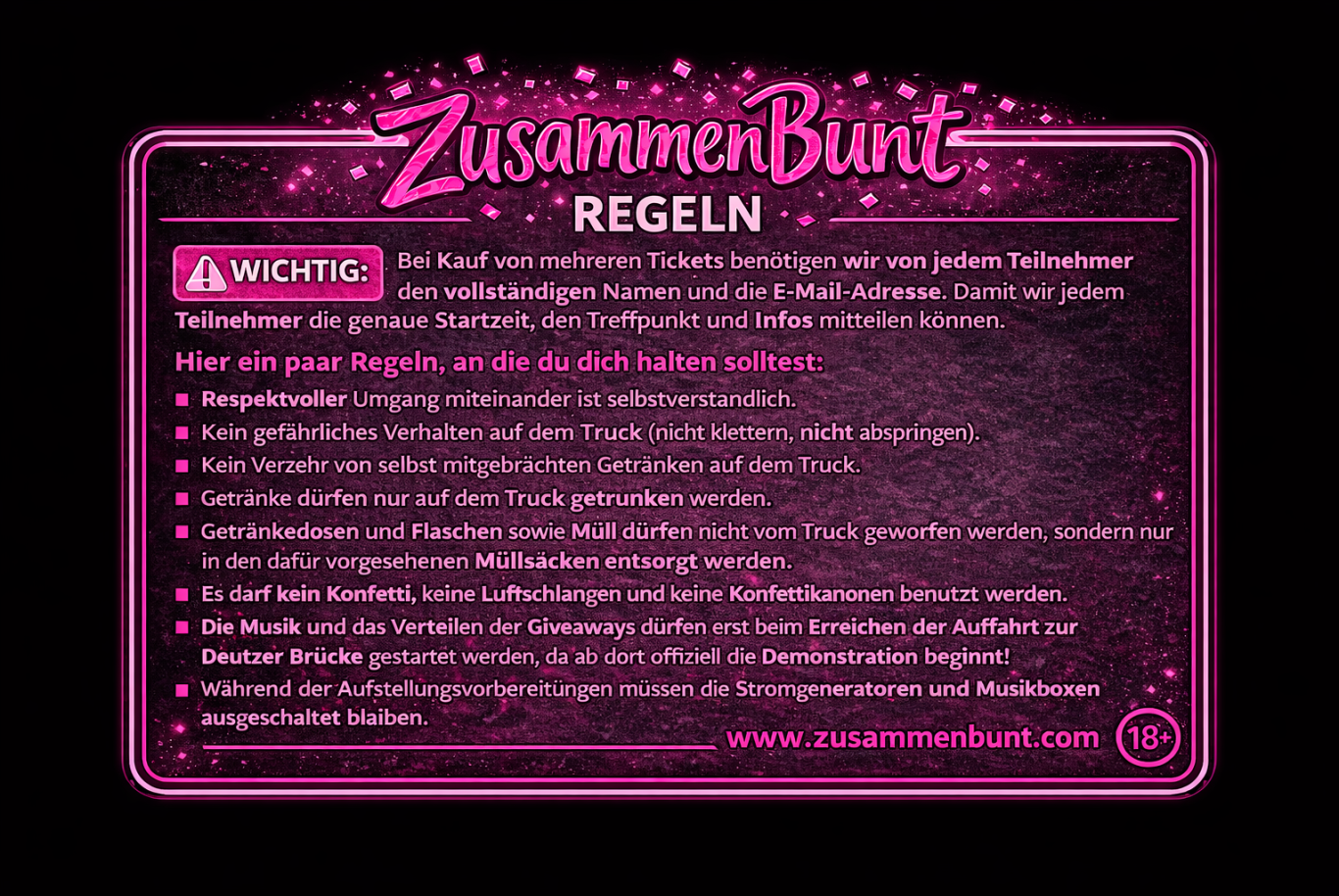Zur Info: Dieser Preis dient ausschließlich der Kostendeckung (Truck, Technik, Genehmigungen, Sicherheit etc.) Wir möchten an der Teilnahme nichts verdienen. Der Gewinn (durch den Getränkeverkauf) wird an diese zwei tollen Vereine gespendet: